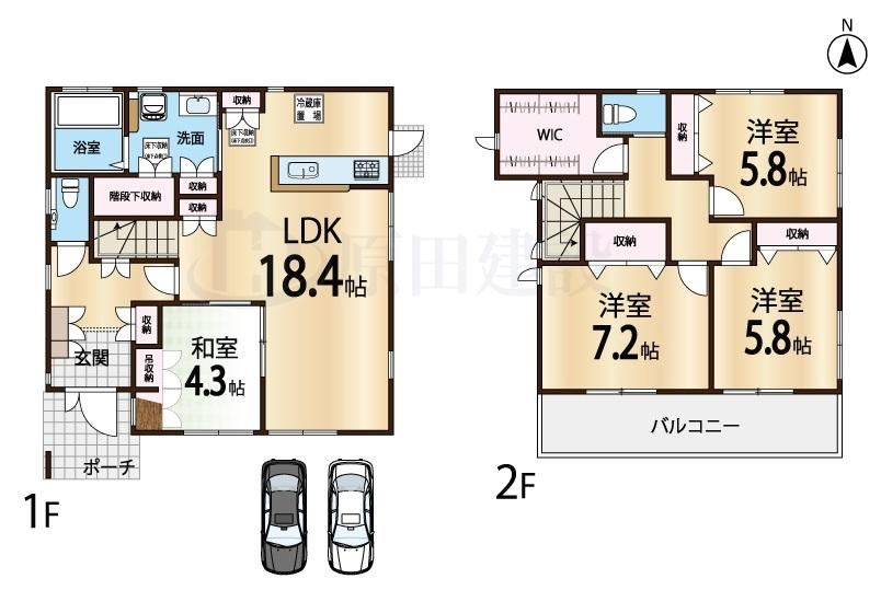 Parking for two carsTwo or more train lines accessibleSpacious 18-tatami LDKSystem kitchenShower-equipped washbasinTwo toiletsTwo storiesWalk-in closetIH cooking heater