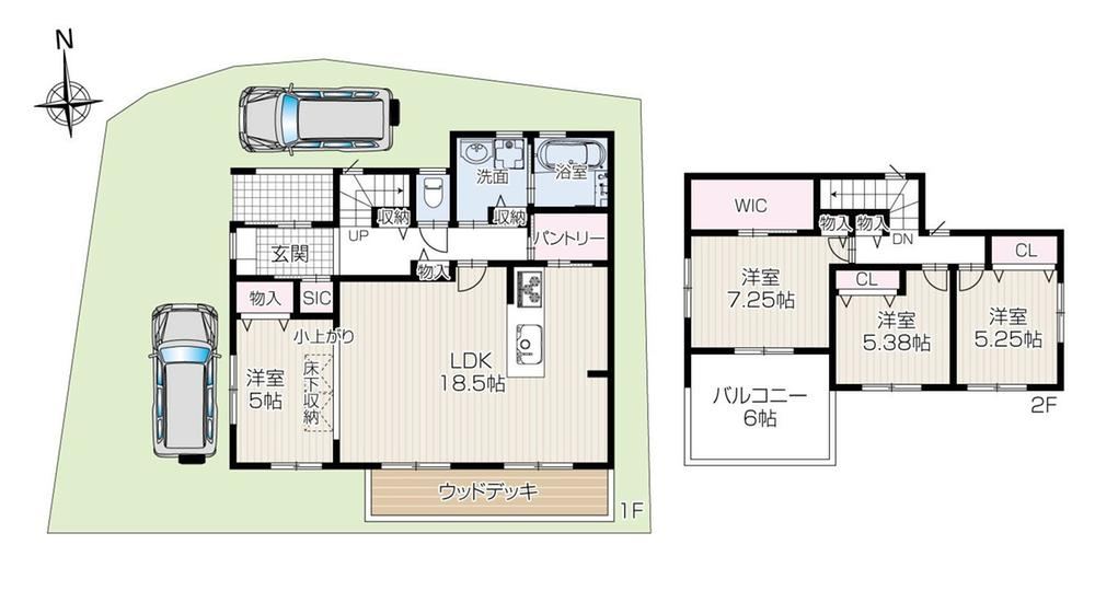 Parking for 2 carsLDK over 18 tatamiSupermarket within 10 minutesSystem kitchenStorage in all roomsQuiet residential areaFlat landOpen kitchen2 storiesSouth-facing balconyUnderfloor storageWood deckPantryWalk-in closetShoe-in closet