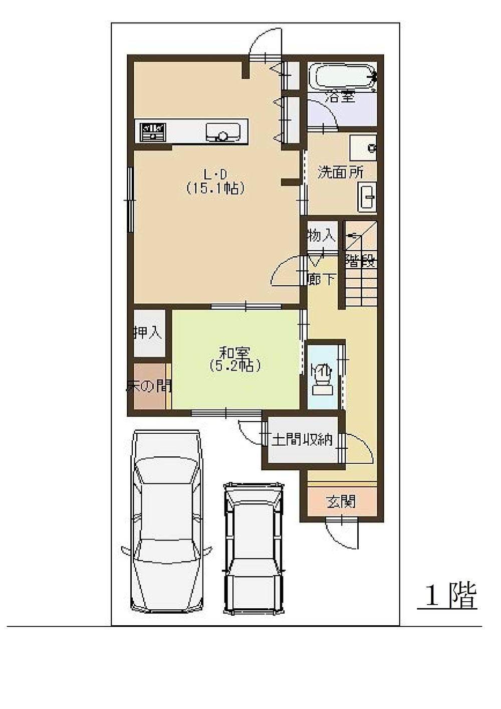 Parking for 2 carsSystem kitchenStorage in all roomsLiving-dining room over 15 tatamiJapanese roomLevel lotOpen kitchenWide balconySpacious bathroom2 storiesTV in bathroomVaulted ceilingCity gasFlat land